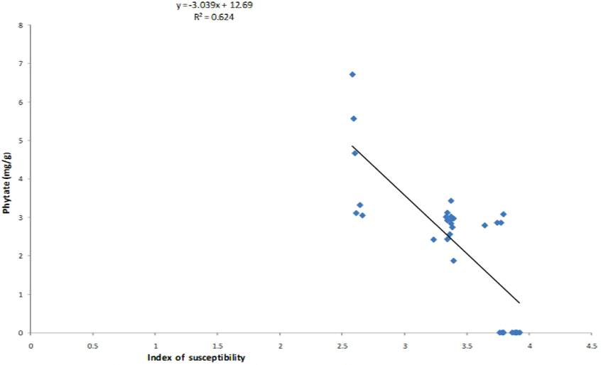 Figure 2 Relationship between index of susceptibility and phytate content of cowpea cultivars