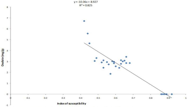 Figure 3 Relationship between index of susceptibility and oxalate content of cowpea cultivars