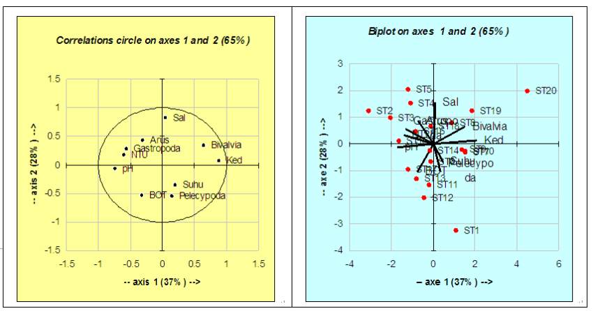Figure 3 Circle of correlation showing the identifiers contributions of environmental parameters on the habitat of the molluscs