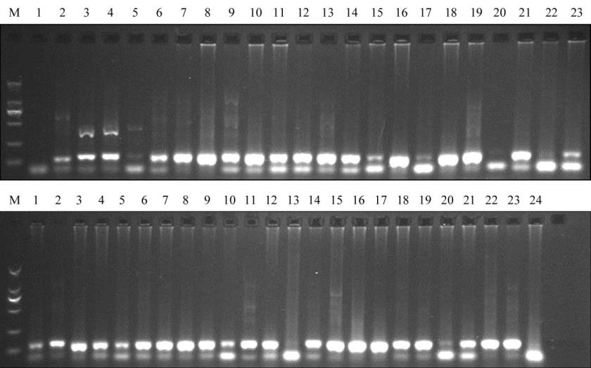 Note: Upper 1~23 and lower 1~24 is 47 wheat accessions DNA; M: DL2000 marker