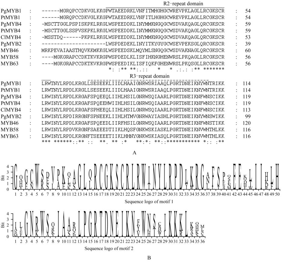 MYB4 with other MYB proteins from NCBI databases; B: The sequence logos of conservation motifs