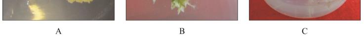 Note: A: Callus; B: Differentiated callus; C: Regenerated plant