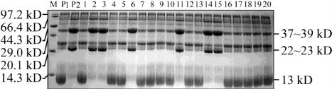 Note: M: Protein marker; P1: W3660; P2: Nanjing46; 1~20: