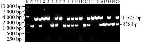 Note: M: DNA Marker; P1: W3660; P2: Nanjing46; 1~20: