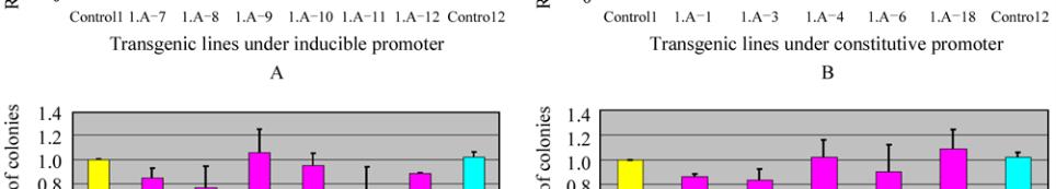 decreased in some transgenic lines but the difference only slight with only one exception (IA-11) where ≥ 30% less colonies were