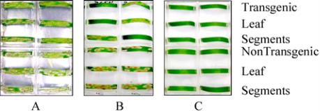 reduction was shown by IA-11 which showed 75% smaller size compared to controls. Control= Non transgenic Florida leaf segments,